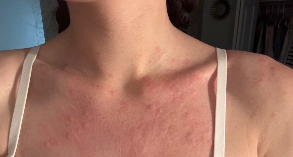 In January 2020, I attended my friends birthday party. It was such a fun time catching up with everyone; until a few days later… I got sick. REALLY sick. A mystery virus brought on a dangerously high fever & other flu like symptoms. My parents rushed me to the doctor not once, but three times in one week as I battled the virus. We had never experienced a cold this relentless. My forehead swelled so badly that my eyes were almost swollen shut and there were welts across my body. It is still hard to put into words how truly scared I was at the time. (Reference photo below)